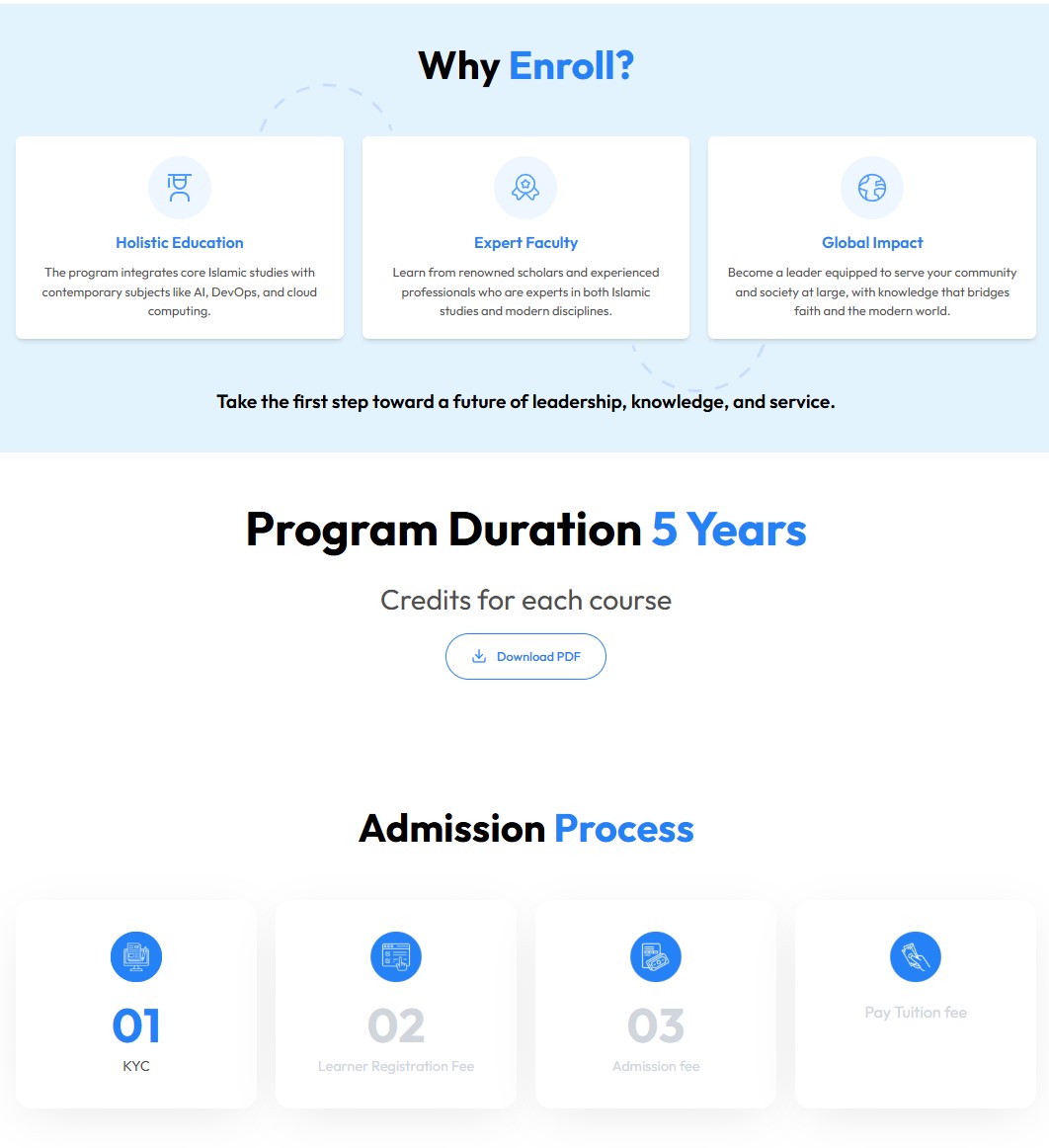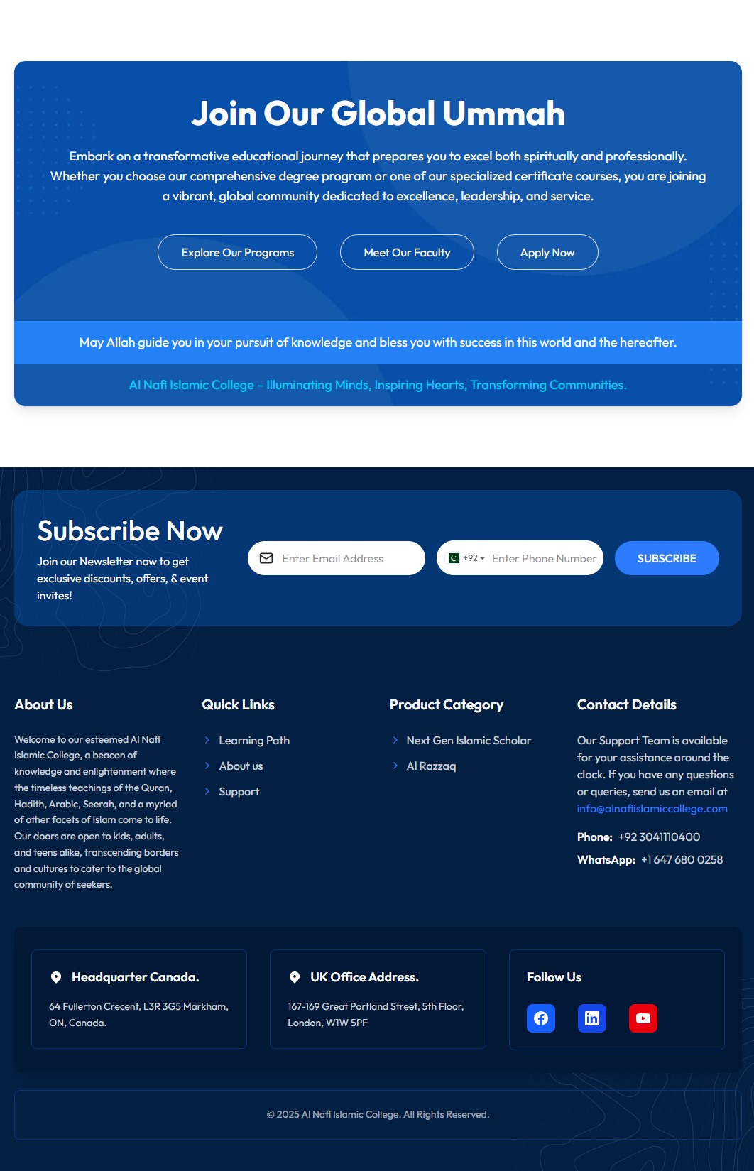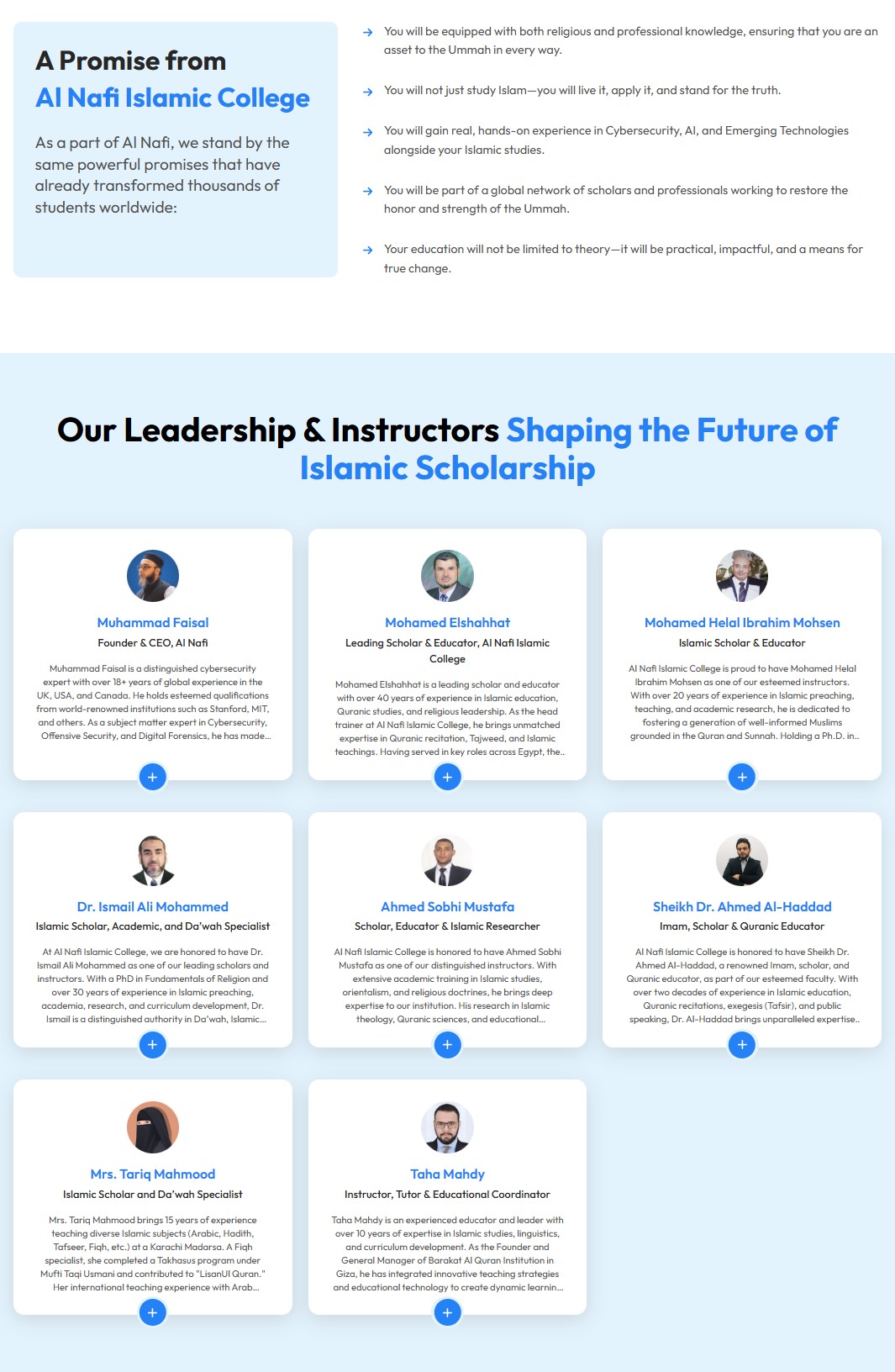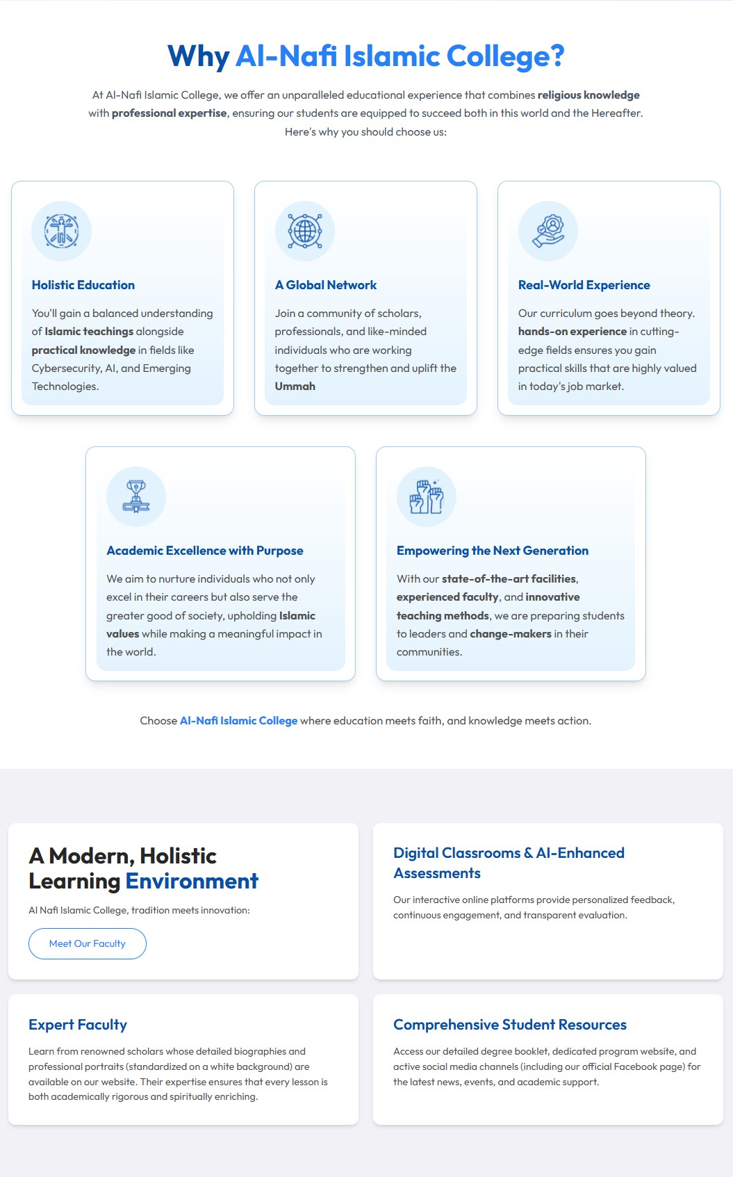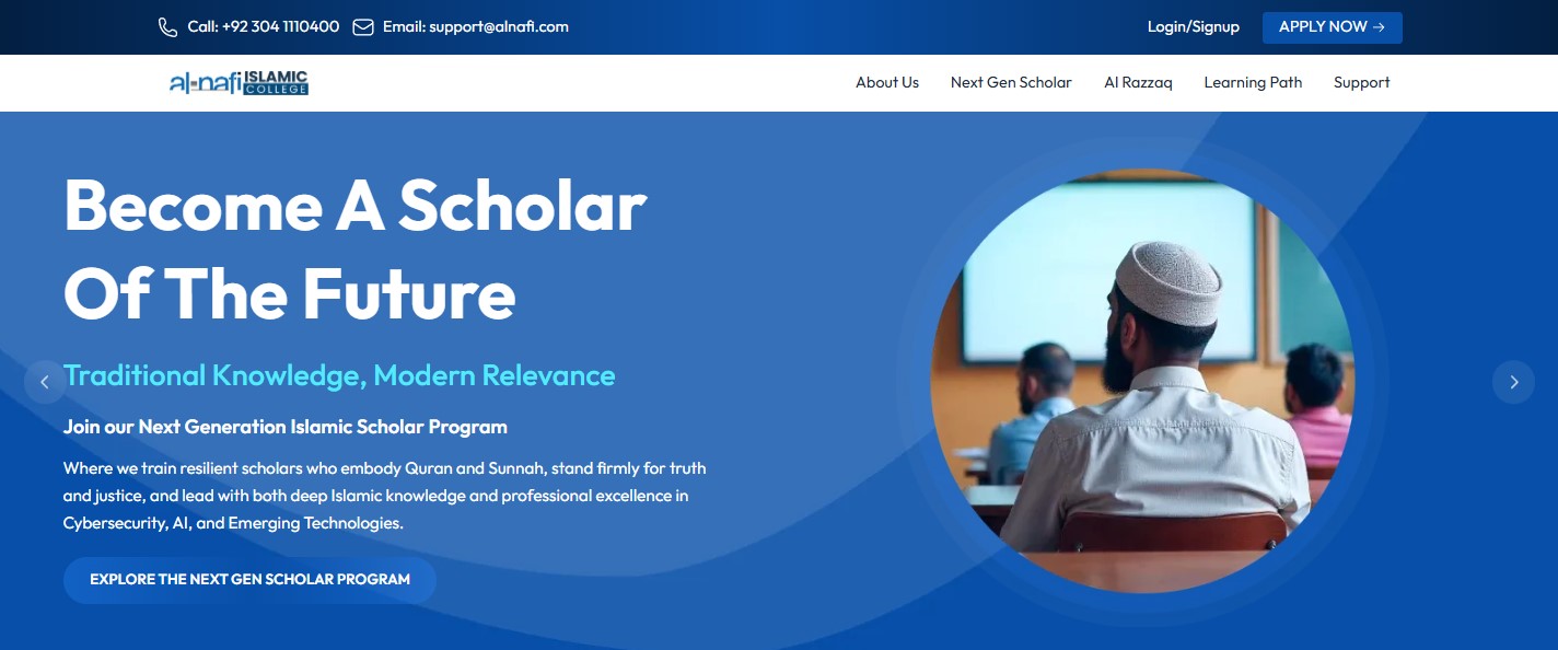 Al Nafi Islamic College is an educational institution dedicated to producing the next generation of traditionally trained scholars and leaders. Our mission is to serve as a leading model for traditional Islamic education globally through a balanced blend of spiritual training and academic studies. We empower our youth to grow into scholarly, self-sufficient, and spiritually grounded leaders who excel both in their faith and in the modern professional world. In addition to our classical Islamic studies, we teach our scholars the worldly skills necessary to excel in professional environments. Our dual-track system integrates modern qualifications, ensuring that our graduates are as capable in the workplace as they are in their spiritual endeavors.